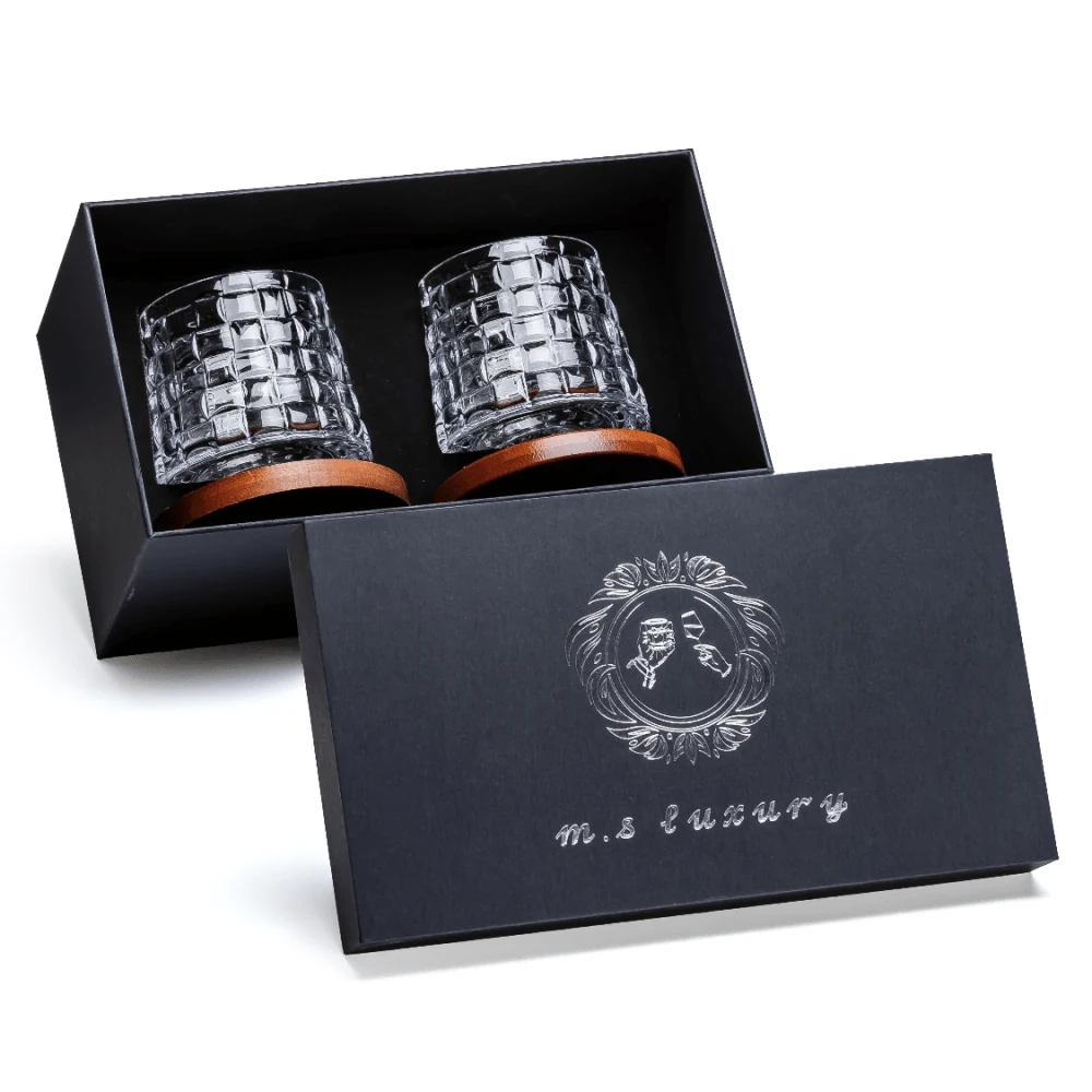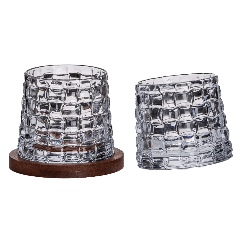 זוג כוסות ויסקי יוקרתיות בעיצוב מהמם , הכוסות מסתובבות על התחתית למטרת פתיחת טעמי הוויסקי , מגיע במארז מתנה הכולל 2 כוסות , ו 2 תחתיות